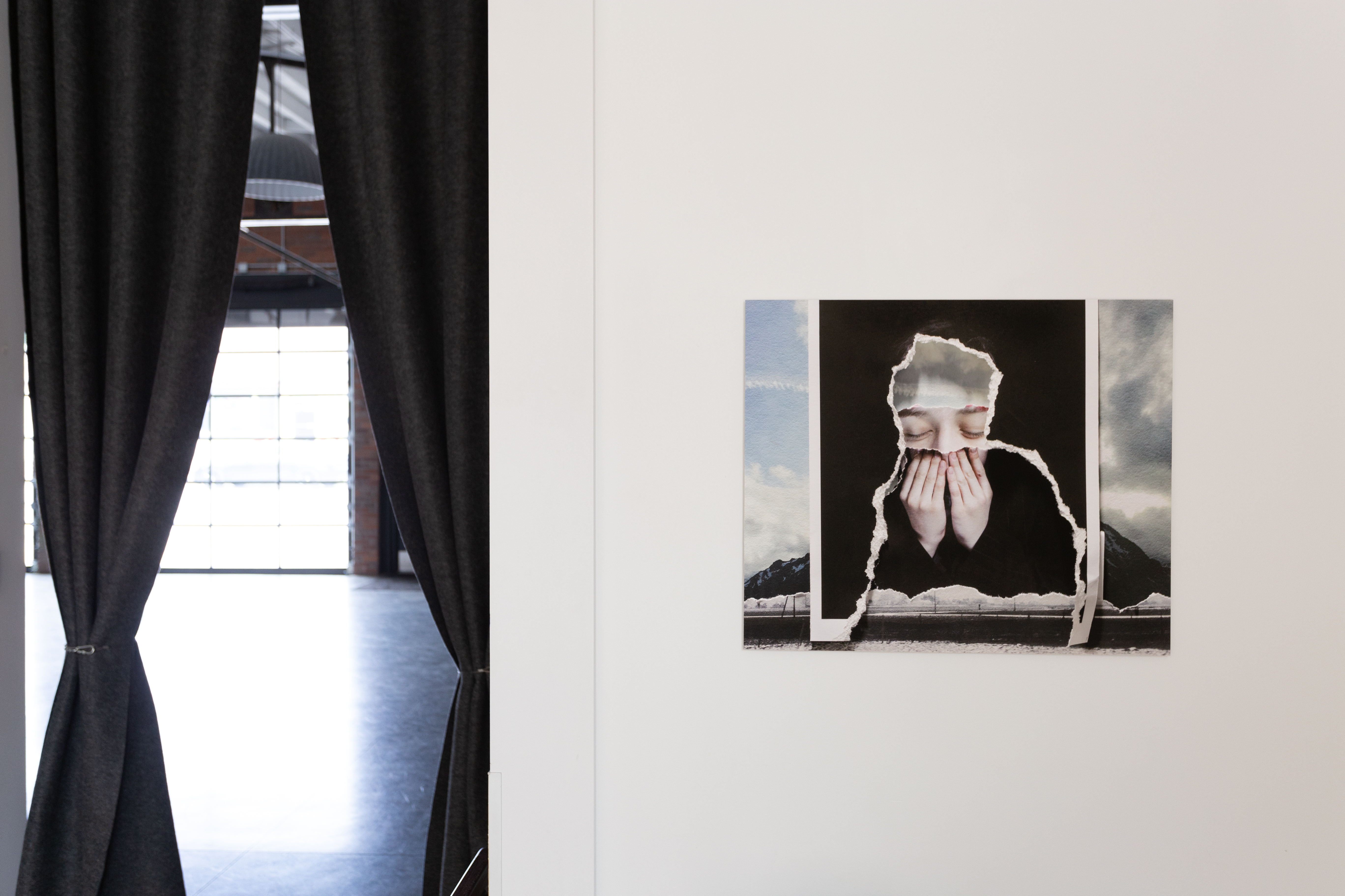 All the included photos come from Sylwia’s own archive or were specifically created to be included in a particular piece. The idea behind using the three-dimensional torn fragments of a textured paper, which are then assembled and reproduced on the same type of paper, was to create a tactile, multidimensional object. The lack of reflection (prints are mounted instead of being encased in a frame behind a glass that would separate them from the viewer) and large scale of the tactile piece of paper invite us to participate with our own emotional response.
